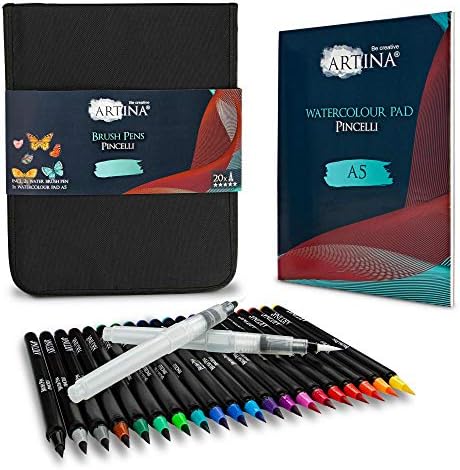 Artina Pincelli Pinselstifte Set 20 Stifte Mit 2 Wassertankpinsel Und A5 Aquarellblock Aquarellstifte In Pinsel Tasche Pinsel Stifte Kaligraphie Watercolor Brush Pen Wasserfarben Stifte Amazon De Burobedarf Schreibwaren